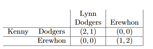 With these ingredients, we can express this game as a “payoff matrix”, where the rows correspond to one player’s actions (me) and the columns correspond to the other player’s actions (Lynn). The left value in each cell corresponds to the payoff I receive if we take those respective actions, and the right value corresponds to the payoff Lynn receives. So I receive more payoff than Lynn if we both go to Dodgers, while vice versa if we both go to Erewhon.