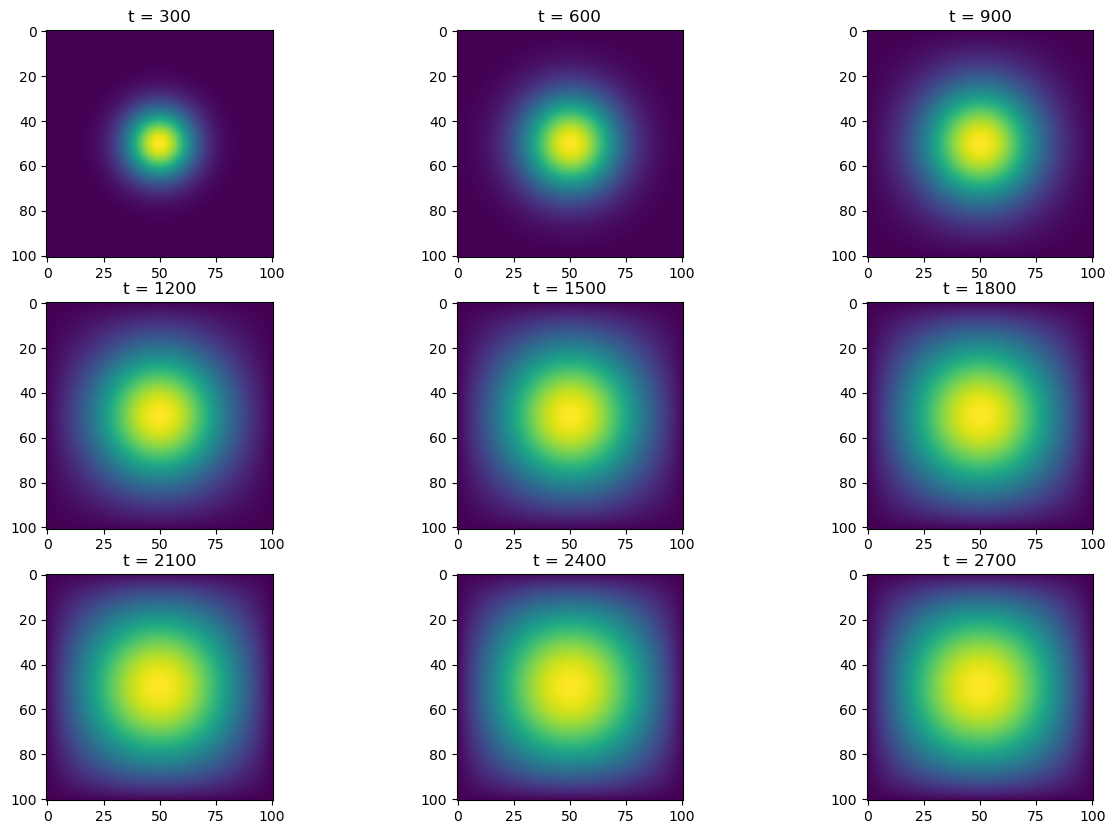 Alright, let’s simulate! We’ll run it for \(2700\) timesteps, and plot the heatmap at every \(300\) steps. Then, we’ll time this process (without the plotting) to see how fast/slow it is.
